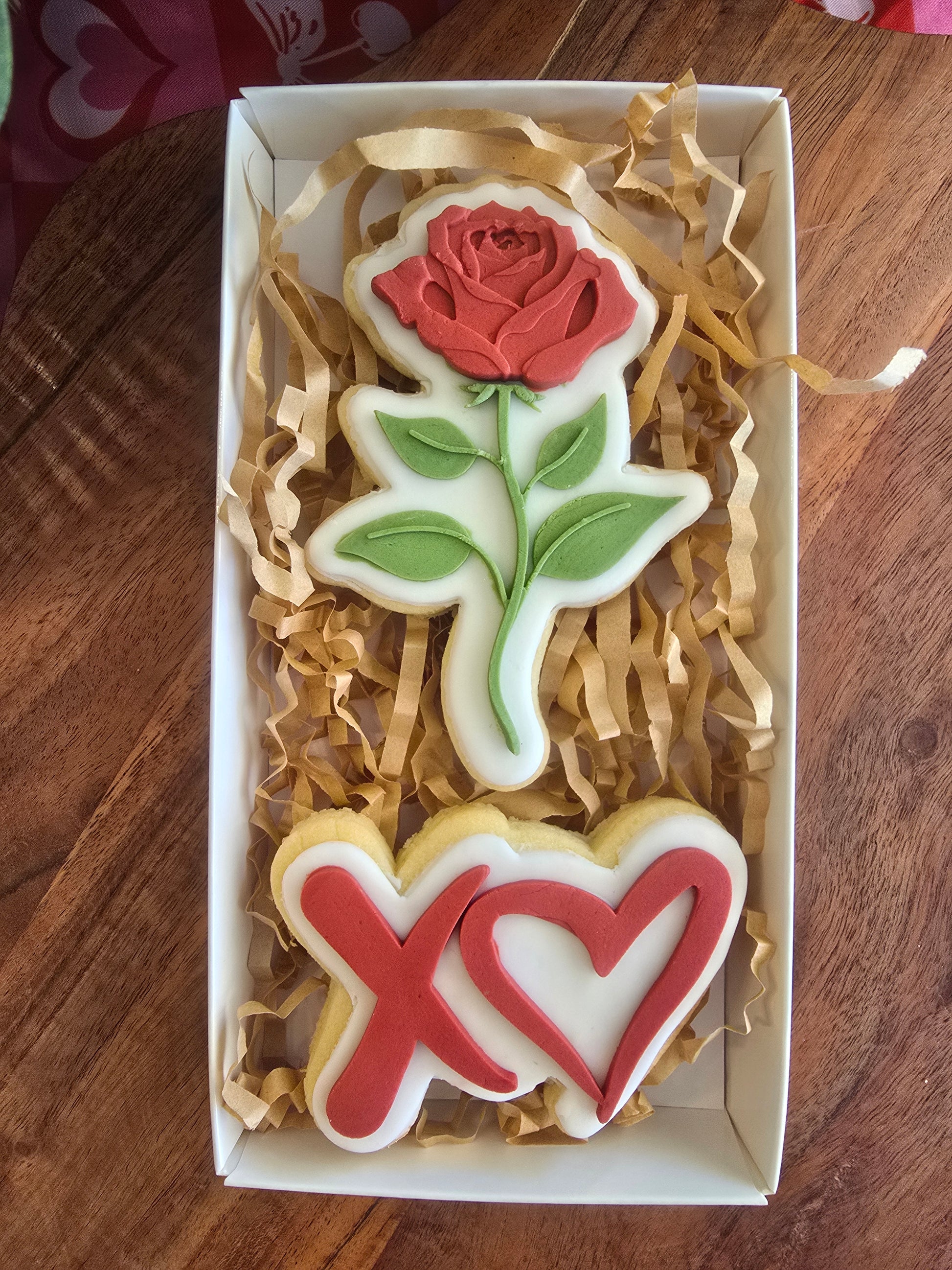 A sweet little Valentine treat featuring two handcrafted vanilla sugar cookies – one finished with a delicate rose design and the other with a classic XO design.